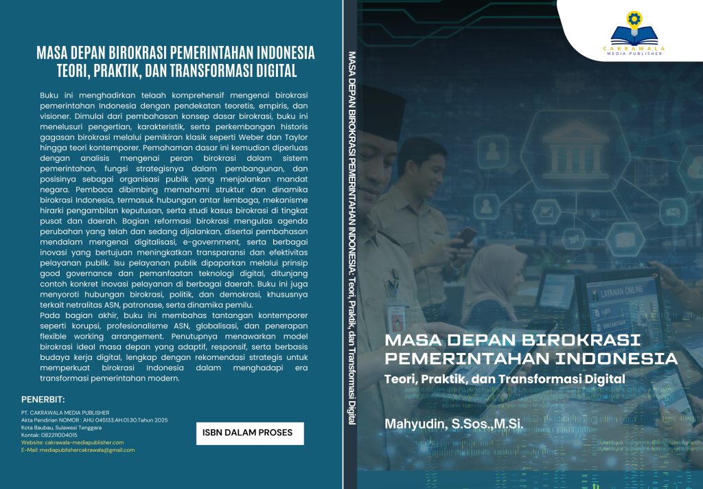 Buku ini menghadirkan telaah komprehensif mengenai birokrasi pemerintahan Indonesia dengan pendekatan teoretis, empiris, dan visioner. Dimulai dari pembahasan konsep dasar birokrasi, buku ini menelusuri pengertian, karakteristik, serta perkembangan historis gagasan birokrasi melalui pemikiran klasik seperti Weber dan Taylor hingga teori kontemporer. Pemahaman dasar ini kemudian diperluas dengan analisis mengenai peran birokrasi dalam sistem pemerintahan, fungsi strategisnya dalam pembangunan, dan posisinya sebagai organisasi publik yang menjalankan mandat negara. Pembaca dibimbing memahami struktur dan dinamika birokrasi Indonesia, termasuk hubungan antar lembaga, mekanisme hirarki pengambilan keputusan, serta studi kasus birokrasi di tingkat pusat dan daerah. Bagian reformasi birokrasi mengulas agenda perubahan yang telah dan sedang dijalankan, disertai pembahasan mendalam mengenai digitalisasi, e-government, serta berbagai inovasi yang bertujuan meningkatkan transparansi dan efektivitas pelayanan publik. Isu pelayanan publik dipaparkan melalui prinsip good governance dan pemanfaatan teknologi digital, ditunjang contoh konkret inovasi pelayanan di berbagai daerah. Buku ini juga menyoroti hubungan birokrasi, politik, dan demokrasi, khususnya terkait netralitas ASN, patronase, serta dinamika pemilu. Pada bagian akhir, buku ini membahas tantangan kontemporer seperti korupsi, profesionalisme ASN, globalisasi, dan penerapan flexible working arrangement. Penutupnya menawarkan model birokrasi ideal masa depan yang adaptif, responsif, serta berbasis budaya kerja digital, lengkap dengan rekomendasi strategis untuk memperkuat birokrasi Indonesia dalam menghadapi era transformasi pemerintahan modern.